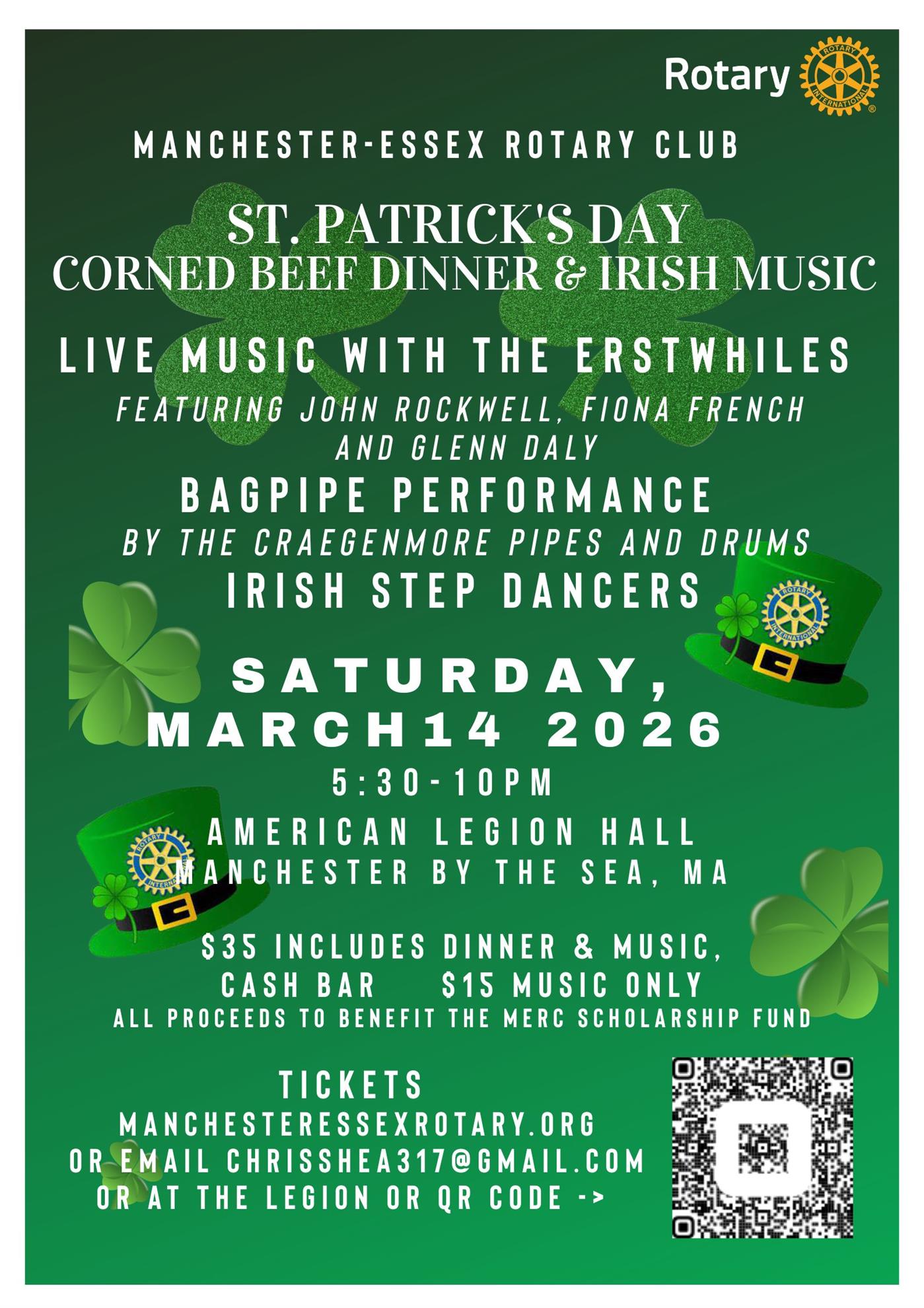 Back by popular demand, the 3rd Annual MERC St. Pat's Dinner & Irish Music will be held on March 16, 2024 5:30 PM - 10:00 PM at the Amaral Baily American Legion Hall, 14 Church Street, Manchester MA.