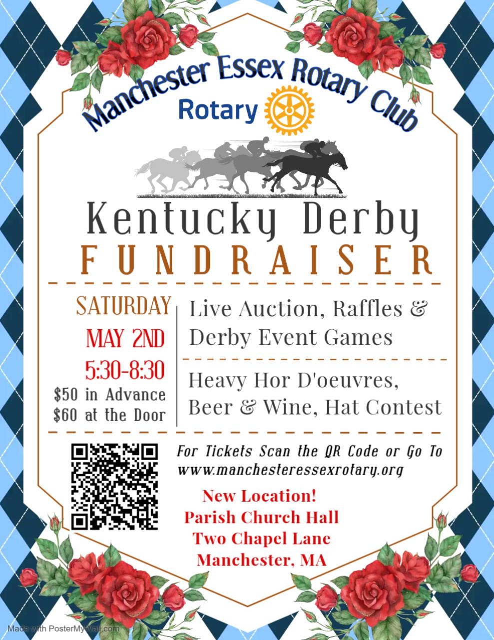 The Club is thrilled to host the 21st Annual Kentucky Derby Party and Auction on Saturday May 2nd from 5:30 to 8:30! We will watch the Kentucky Derby and add some race day games and raffles to add to the excitement. Directly afterwards there will be a live auction featuring an auctioneer and State Senator Bruce Tarr for items including pro sports tickets, golf outings, condo stays in Florida and Marthas Vineyard, beach barbecues, boat cruises and more! The much anticipated hat contest with the best woman's and men's hat winning a bottle of real Kentucky bourbon and a bouquet of roses. Refreshments include beer, wine and heavy hors d'oeuvres, and best of all we are raising money for local scholarships, food banks and international projects. So put on your Derby hats and be ready to have a fun time with fun people. Tickets can be purchased in advance online or from a member for $50 or at the door $60. Follow the link to buy online or click the poster or scan the QR code.